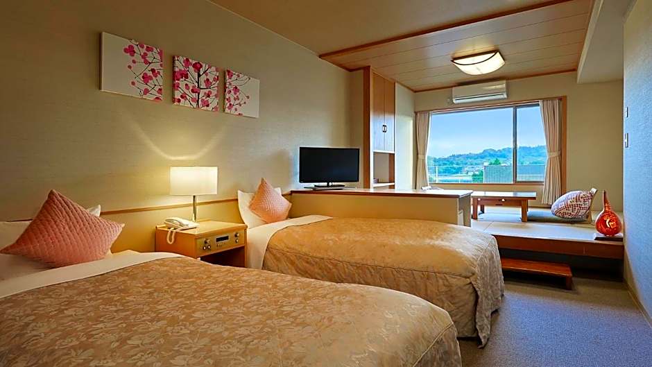 The twin room offers air conditioning, tatami, as well as a private bathroom boasting a bath and slippers. The twin room provides a tea and coffee maker, a wardrobe, yukata, as well as a flat-screen TV. The unit has 2 beds and 2 futons.